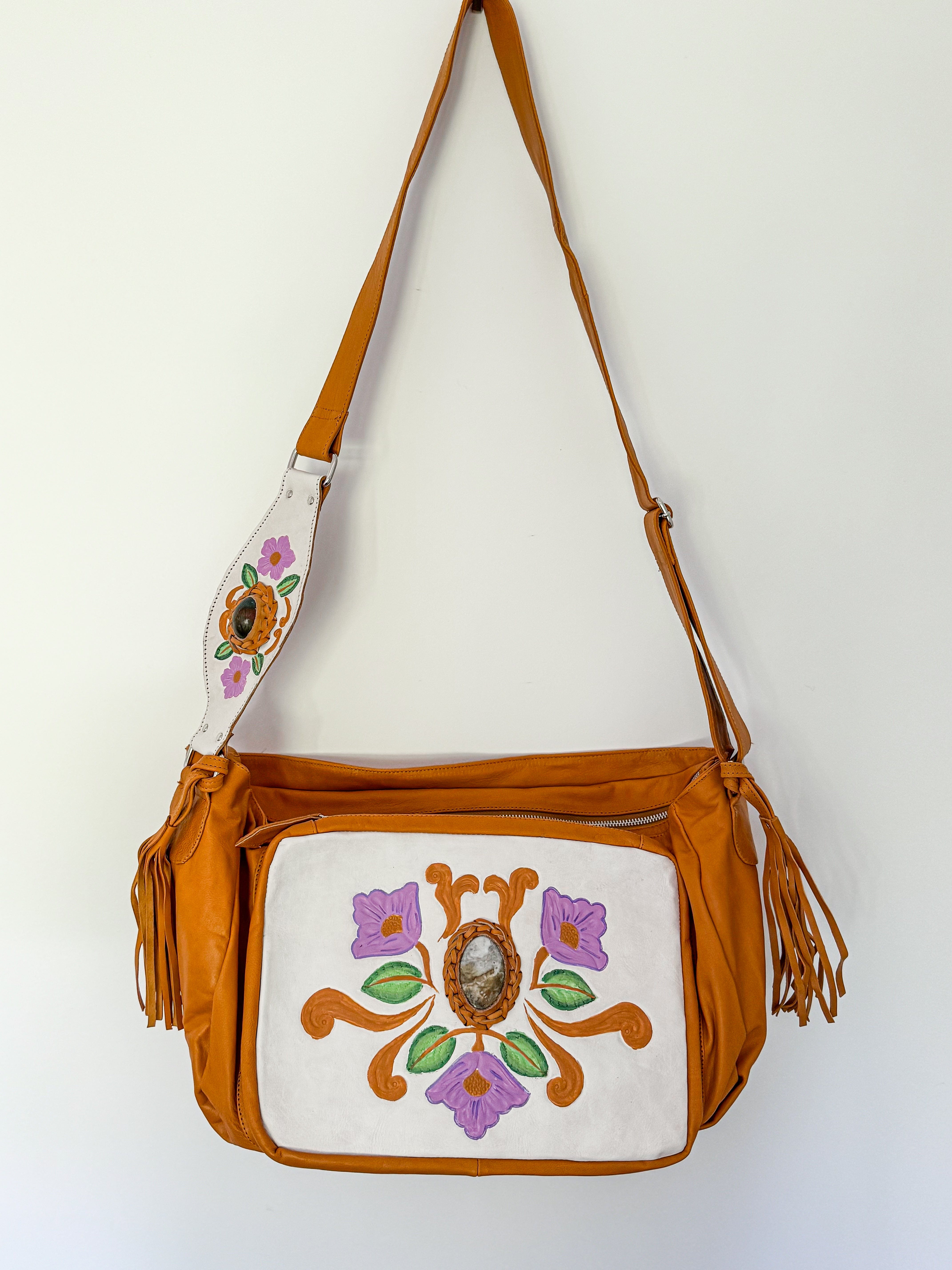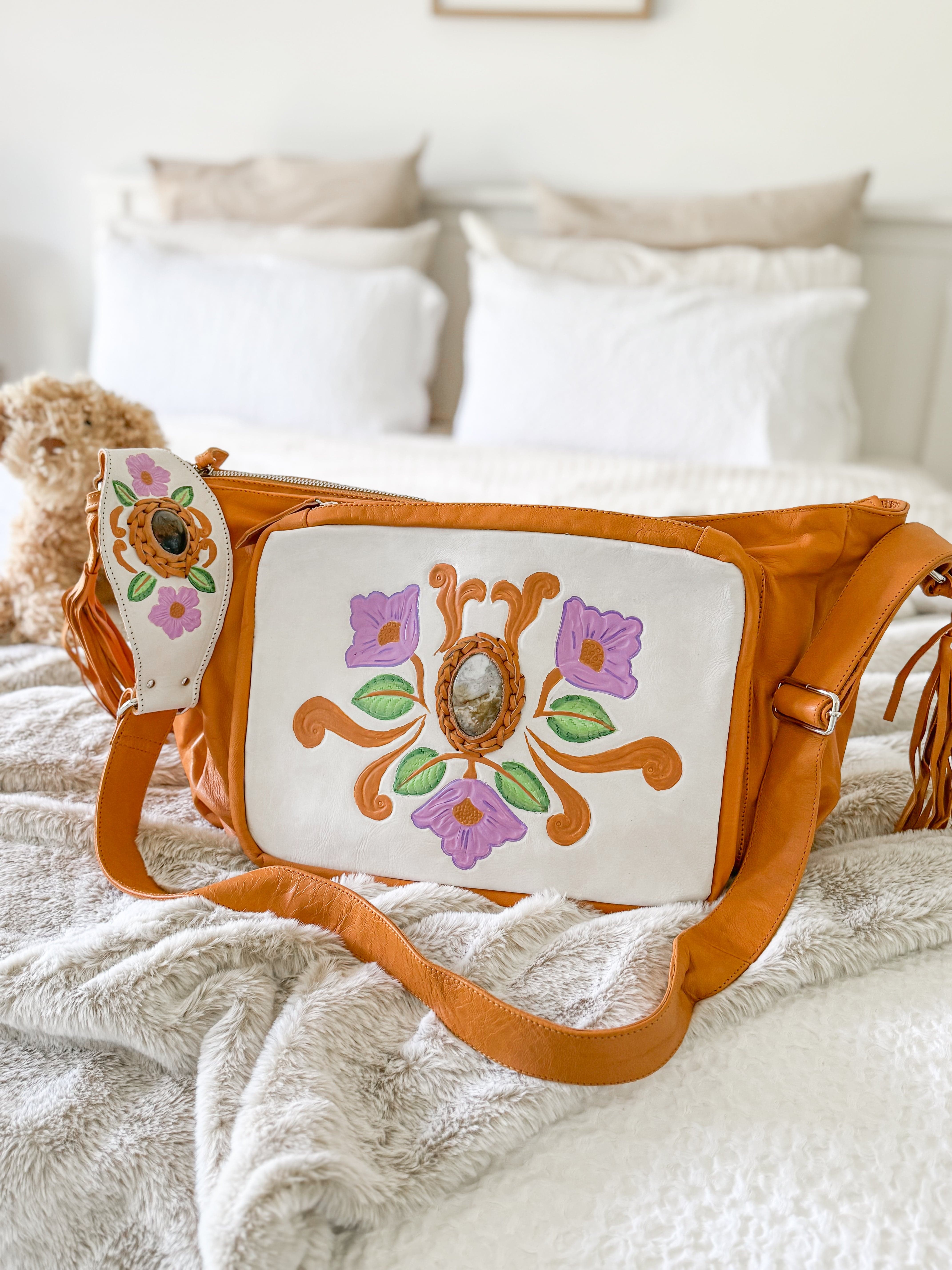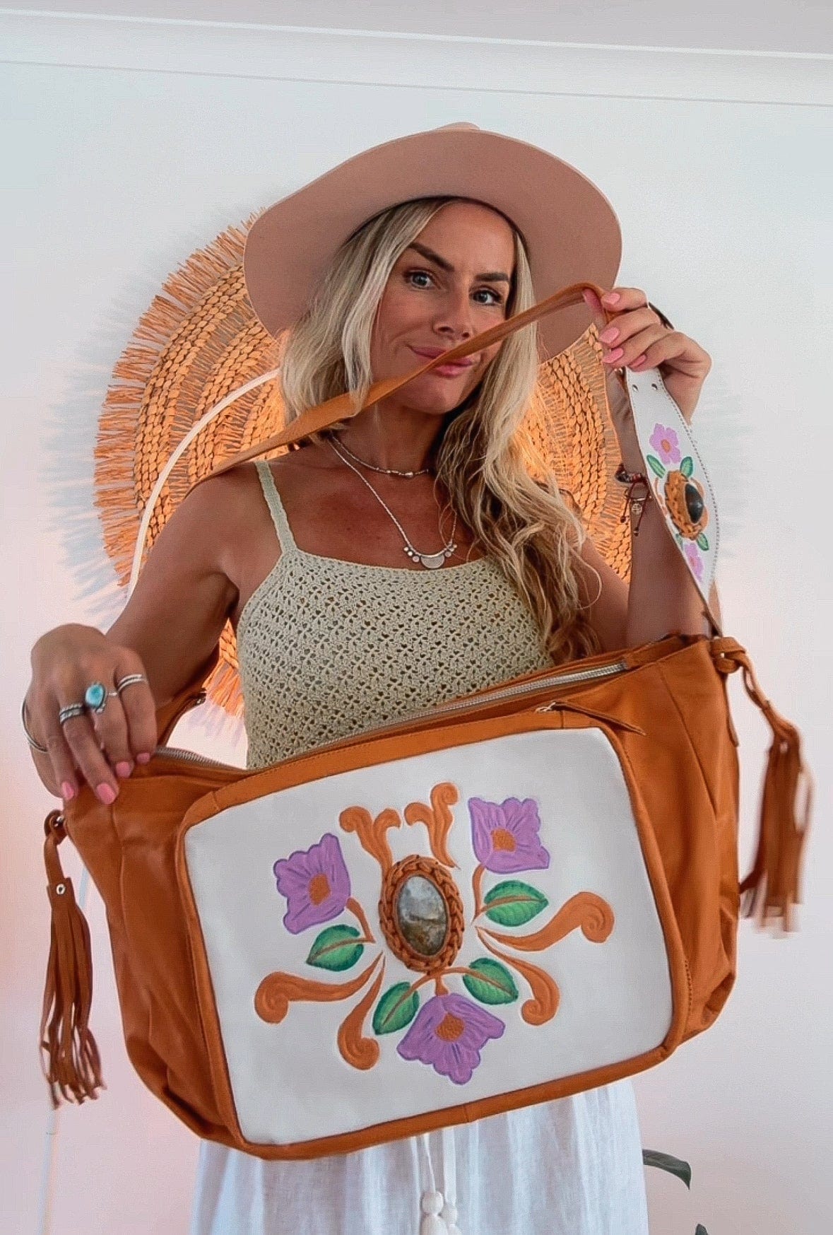 Mahiyas Hand-Painted Leather Baby Bag / Overnighter – Boho Luxe for the Free-Spirited Soul