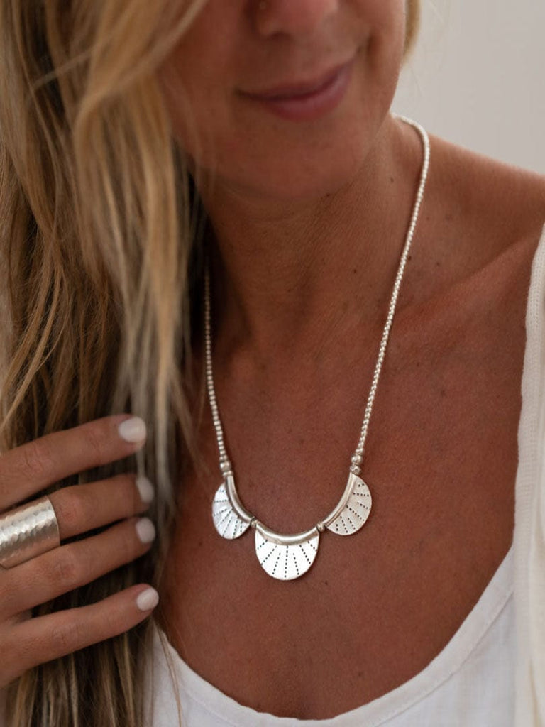 Embella's former 'Pippies Necklace' in a brand new design. The Pippi Beach Necklace features three hand-pressed Hilltribe silver crescent moon shaped pendants strung onto an adjustable polywax cord.