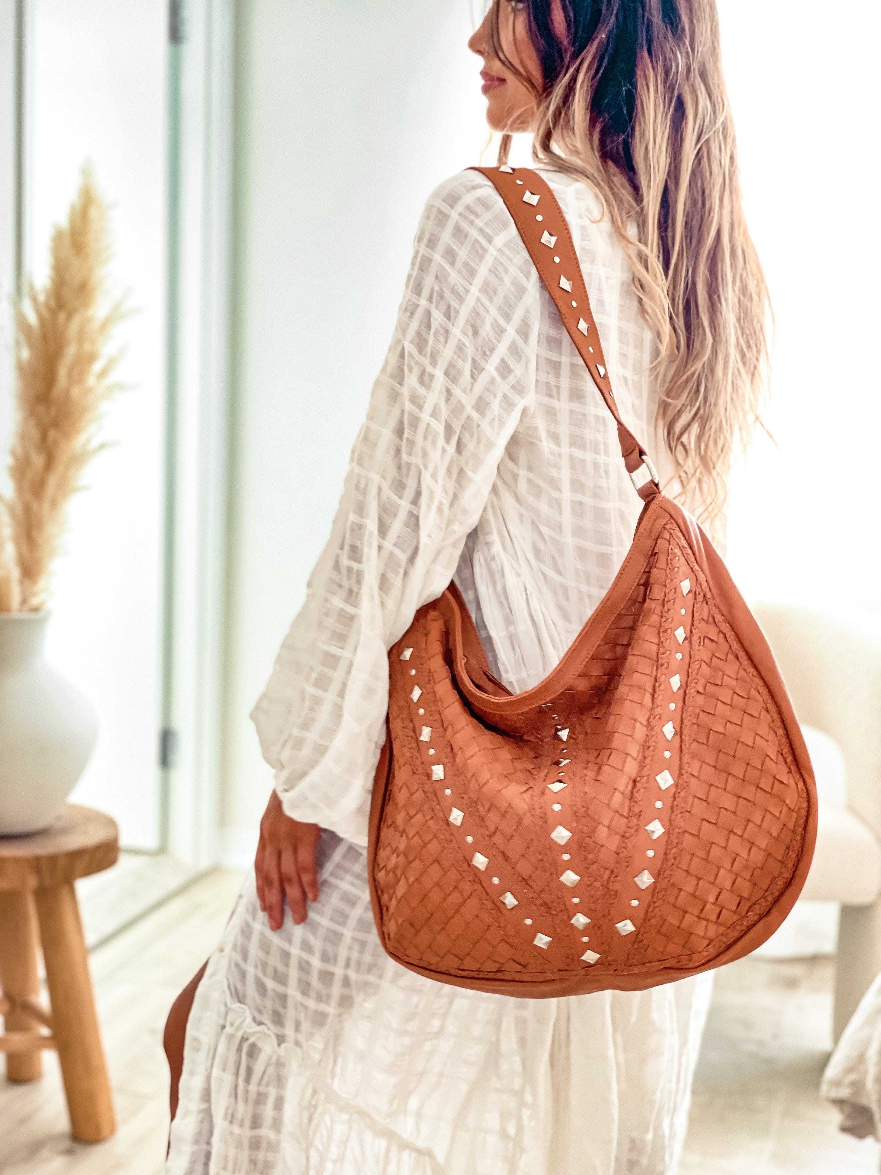 Immerse yourself in the allure of the Gwen Handbag - Mahogany, a captivating boho masterpiece that effortlessly embraces a seventies-inspired slouch design and embellished studded hardware. Evoking the carefree spirit of an era gone by, this handbag is a stunning tribute to timeless bohemian aesthetics.
