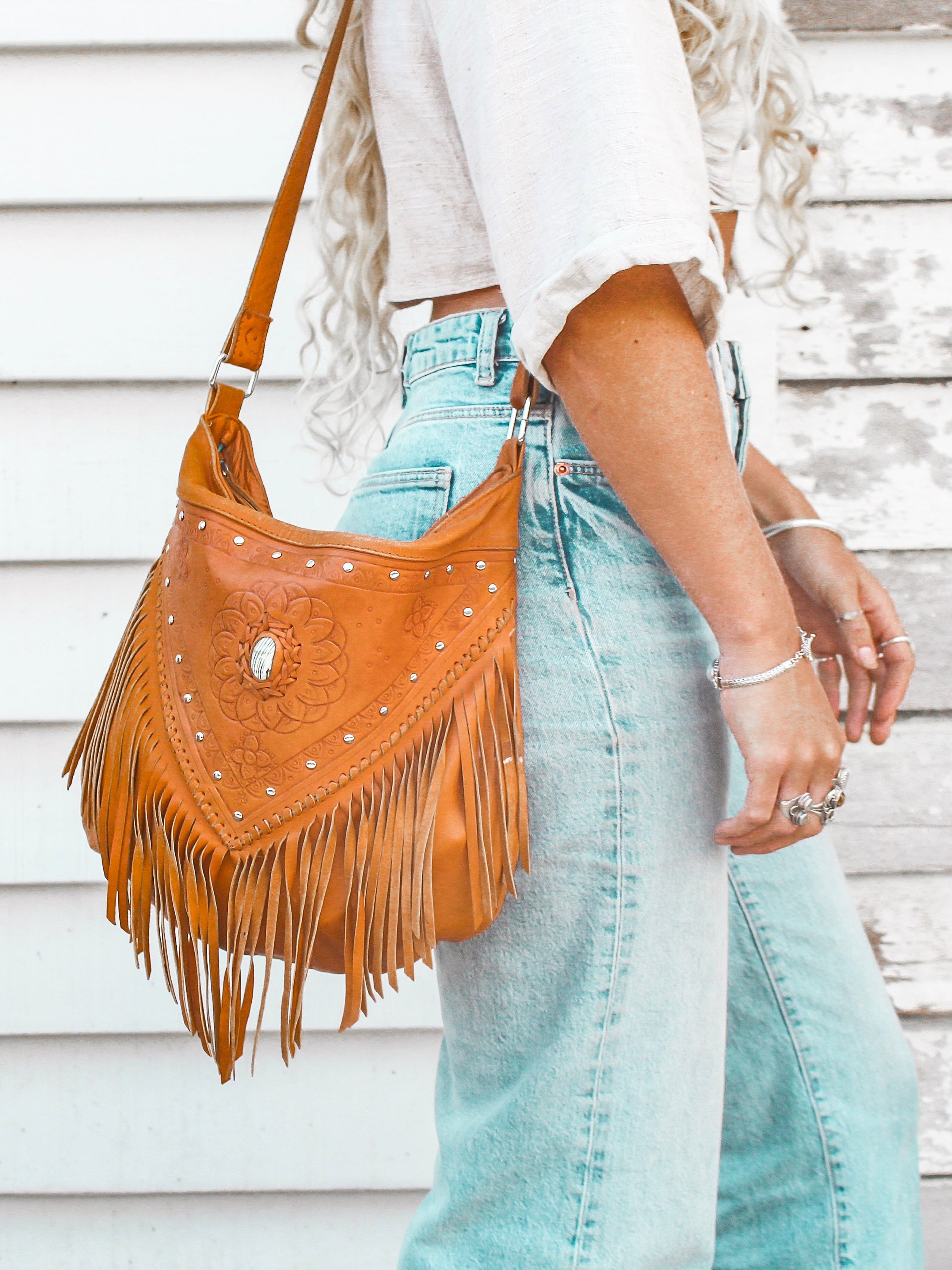 Embrace the comfort and style of the Harlow Bag, boasting soft leather fringing and an adjustable hand-tooled strap that makes it an ideal companion for everyday wear. Whether you're exploring city streets or dancing under the stars at a music festival, this bag effortlessly complements your bohemian spirit.