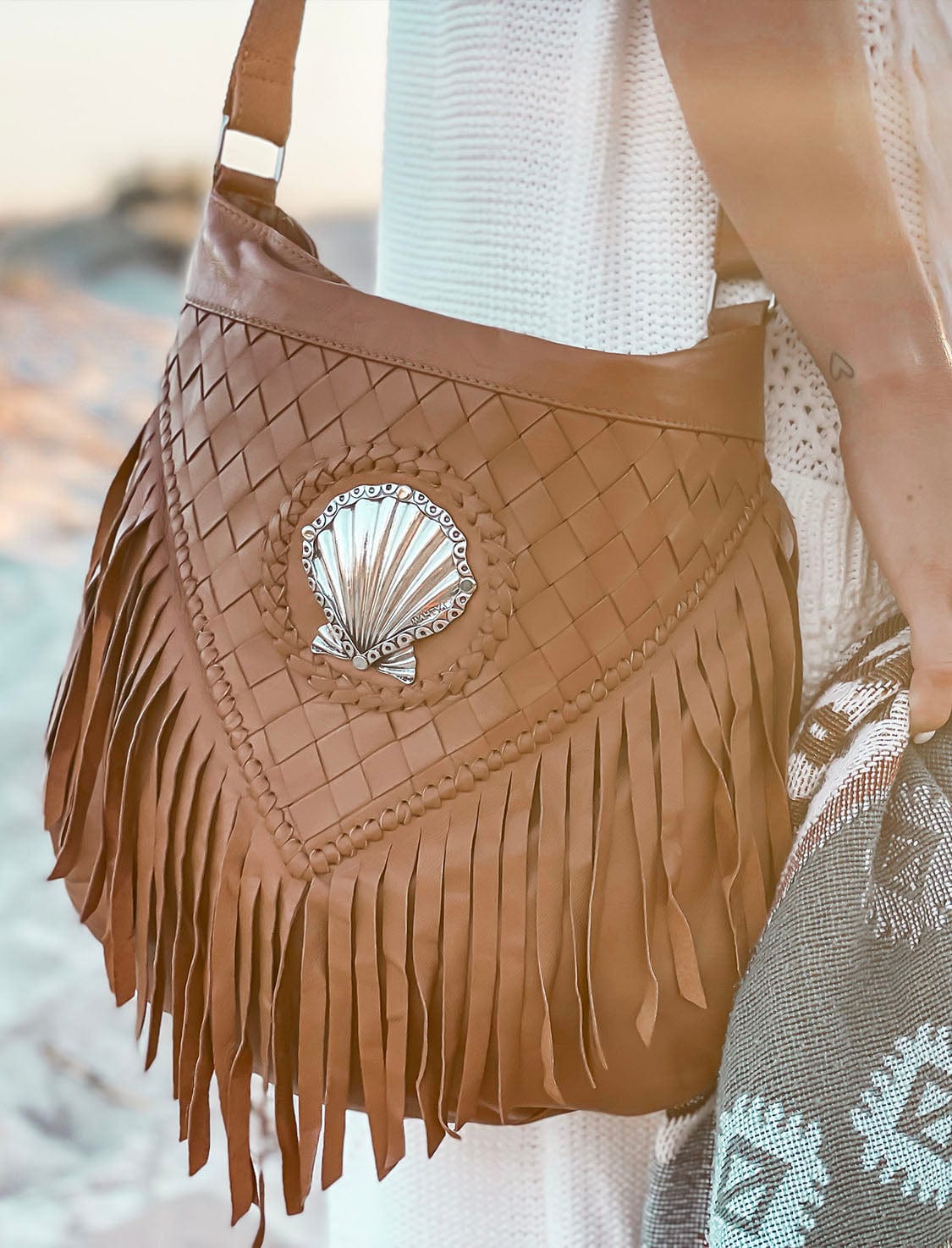 Embark on a seaside journey with the Ocean Lover Bag, a captivating boho wonder adorned with a new Clam Shell metal inlay and delicate fringing. This bag pays homage to the boundless allure of the ocean, capturing its essence in every handcrafted detail.