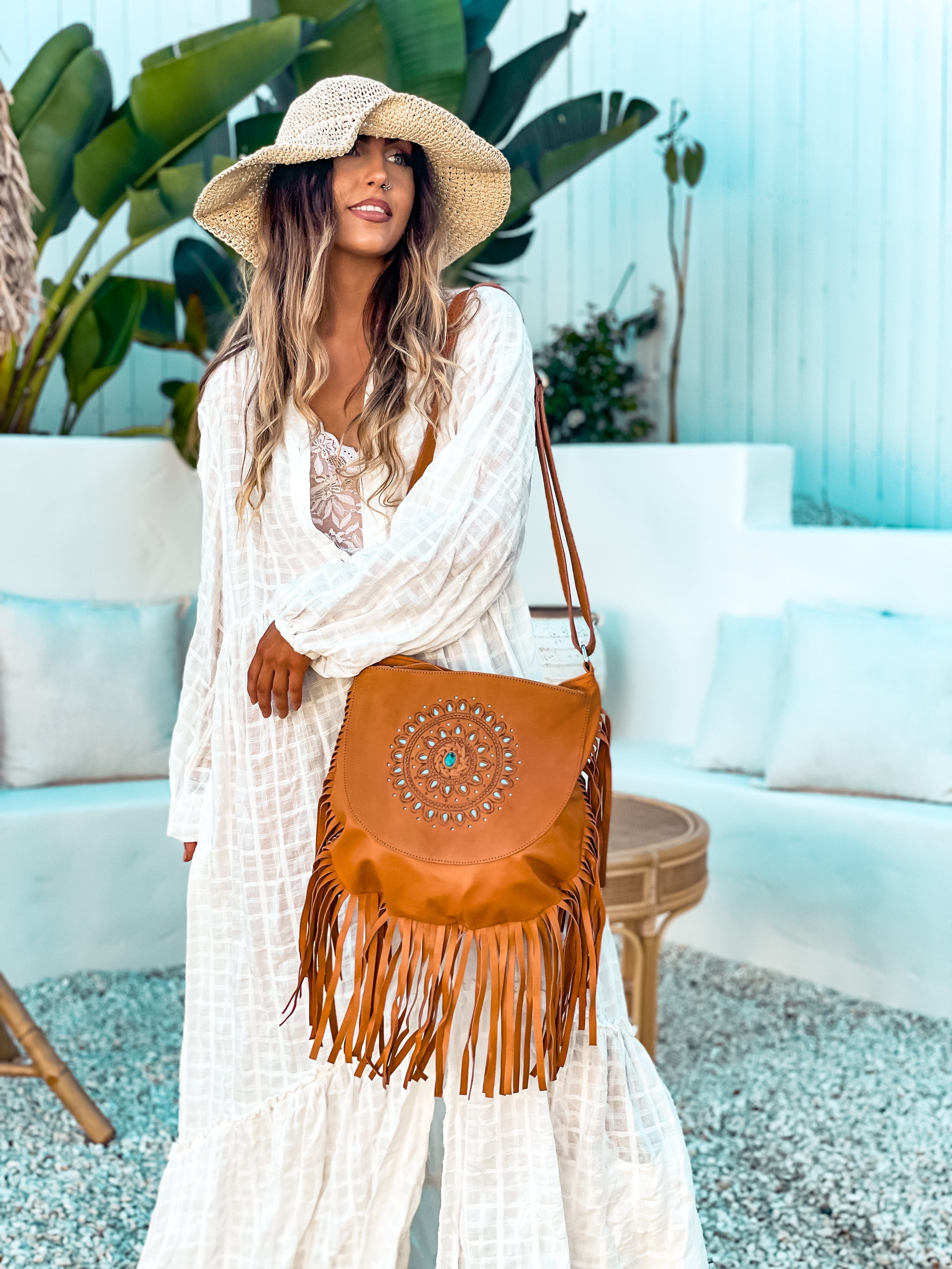 Swooning over our new Sapphire Coast leather bag. Inspired from the crystal blue waters of the West Coast of Australia this stunning boho bag with handy front pocket and adjustable strap can go from day to night. Featuring a turquoise look inlay and hand cut leather detailing.
