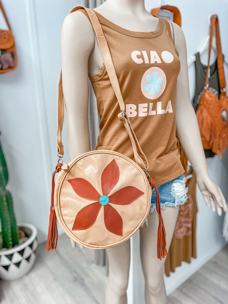 Designed for the modern flower child, this round wonder features a spacious interior, perfect for stashing your essentials as you dance through life's adventures. The premium leather construction ensures durability, making it a reliable companion for your boho escapades.