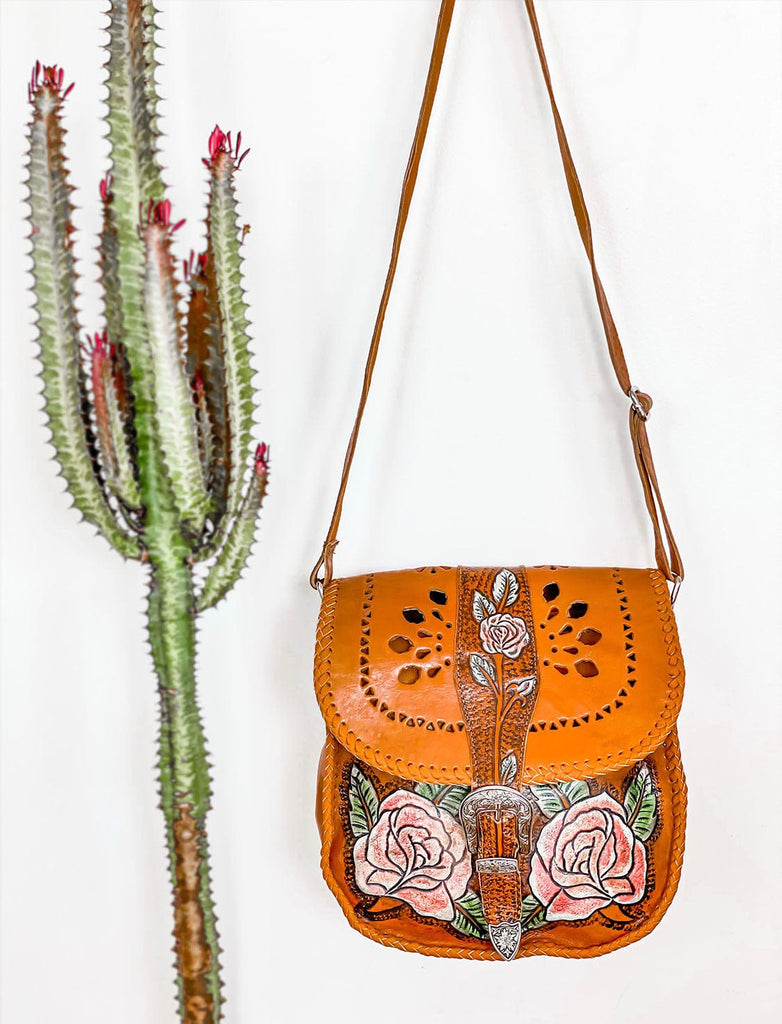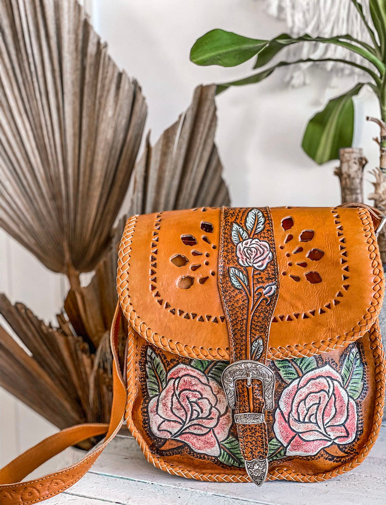 Embodying the 70's style our sweet Rosie will transport you back to the days of Woodstock and Stevie Nicks. Featuring hand painted rose design and press studded buckle closure (no need to undo) and inside zipper this statement piece is one of our favs.