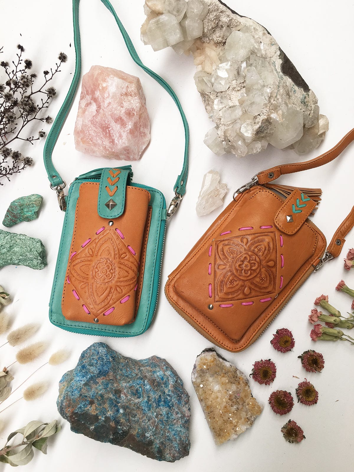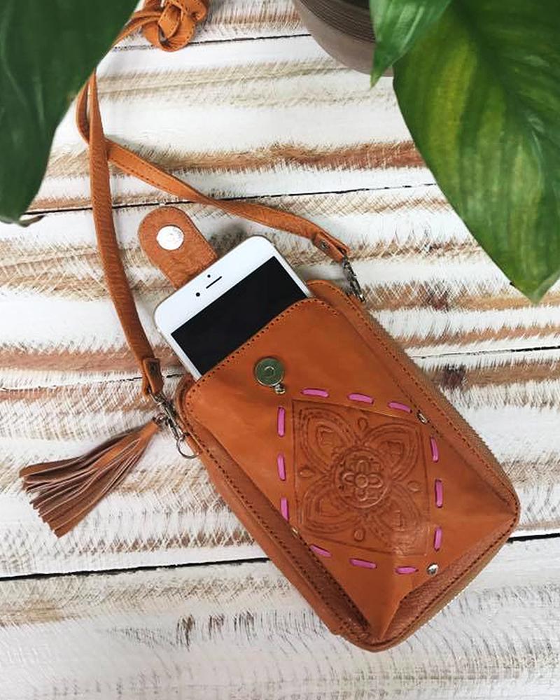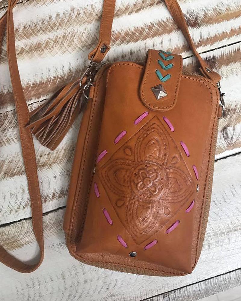 Get snap happy this festival season with our new Falls Phone Pouch Bag in Tan Leather. Have easy access to your phone with a cute little hand tooled leather front pouch, plus loads of room inside for cash, ticket and cards, and a newly added zipped section for your coins. Includes a detachable body strap so you will be hands free while you dance the day away!