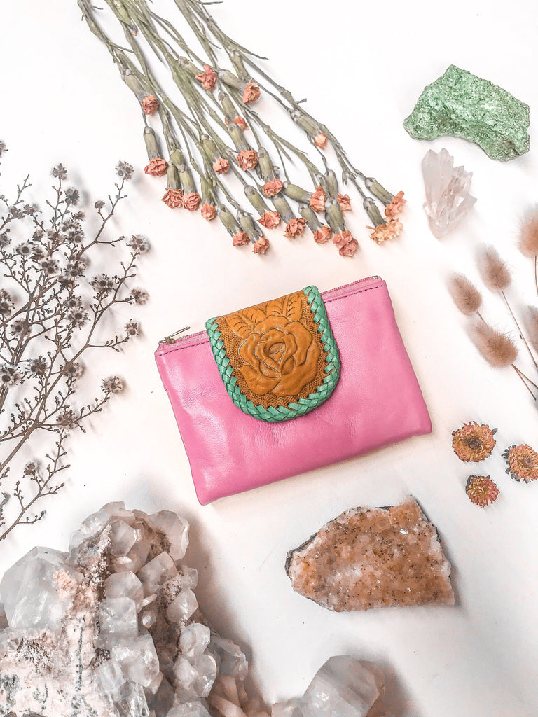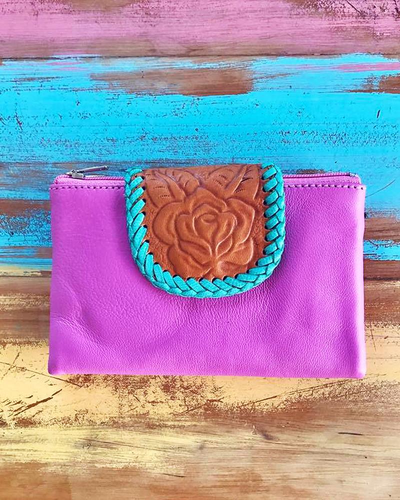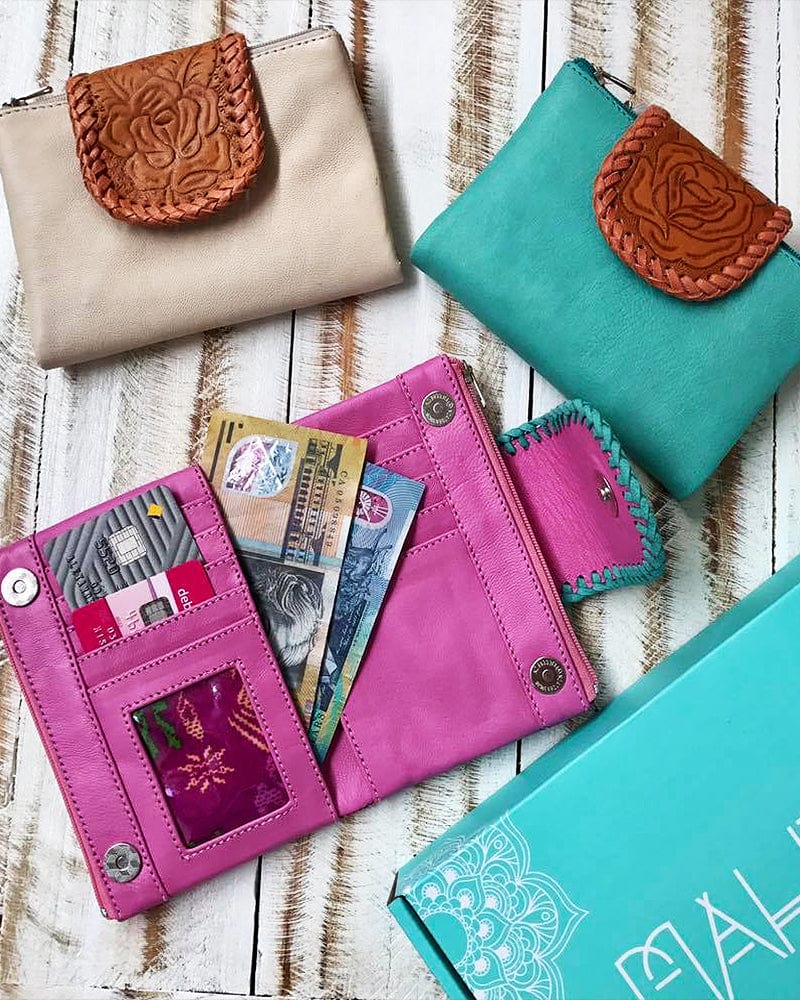 The beautifully simple and compact Kaya Leather Wallet has two zippered pockets as well as card slots held together with brass snap enclosures. Choosing from the 4 alluring colours will be difficult, as the Pink, Turquoise, Tan and Khaki softened leather pouches are all equally pleasing. The intricately hand tooled closure bordered with leather weaving steals the show, however, making you glad to reach for your wallet while out for lunch with the girls.