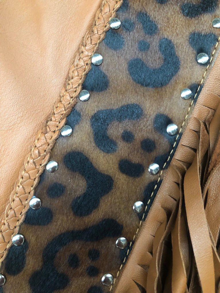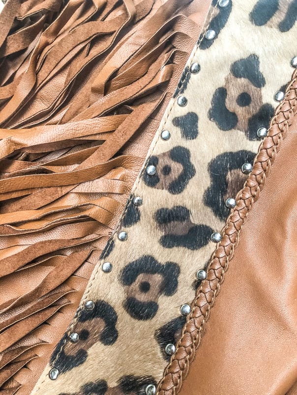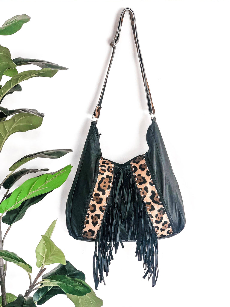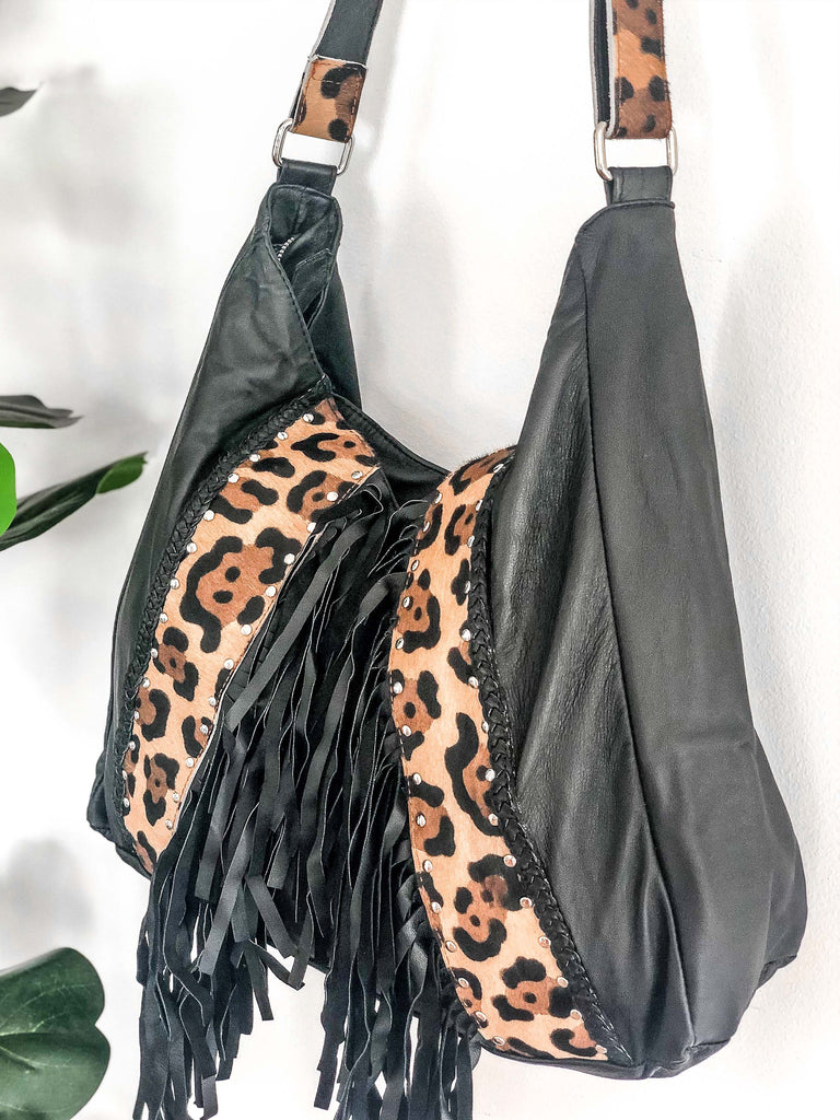 Introducing a spicy new addition to the Mahiya leather bag range...The Maya Bag. This exotic piece features soft fringing and cow hide detailing, the print on the cow hide was created to replicate Jaguar print . Team with our Minca Purse for the ultimate set.