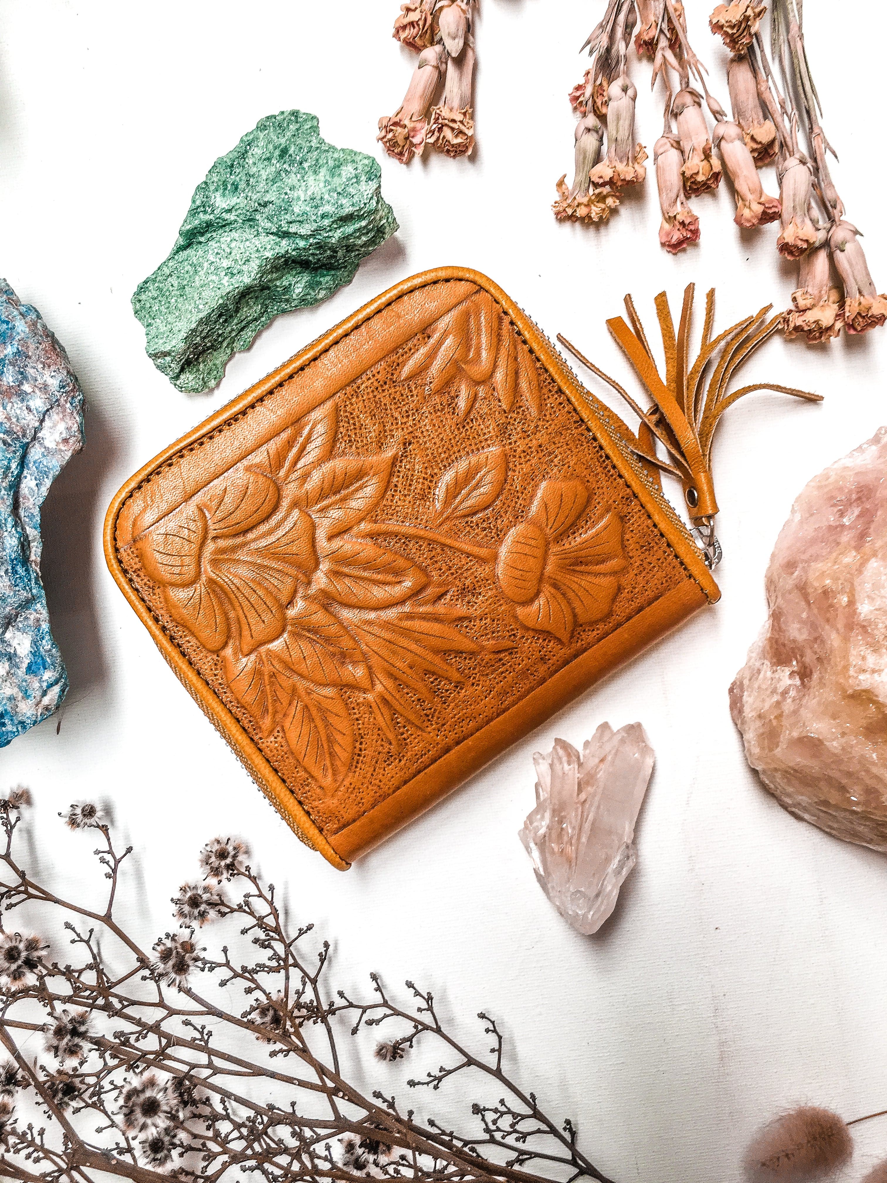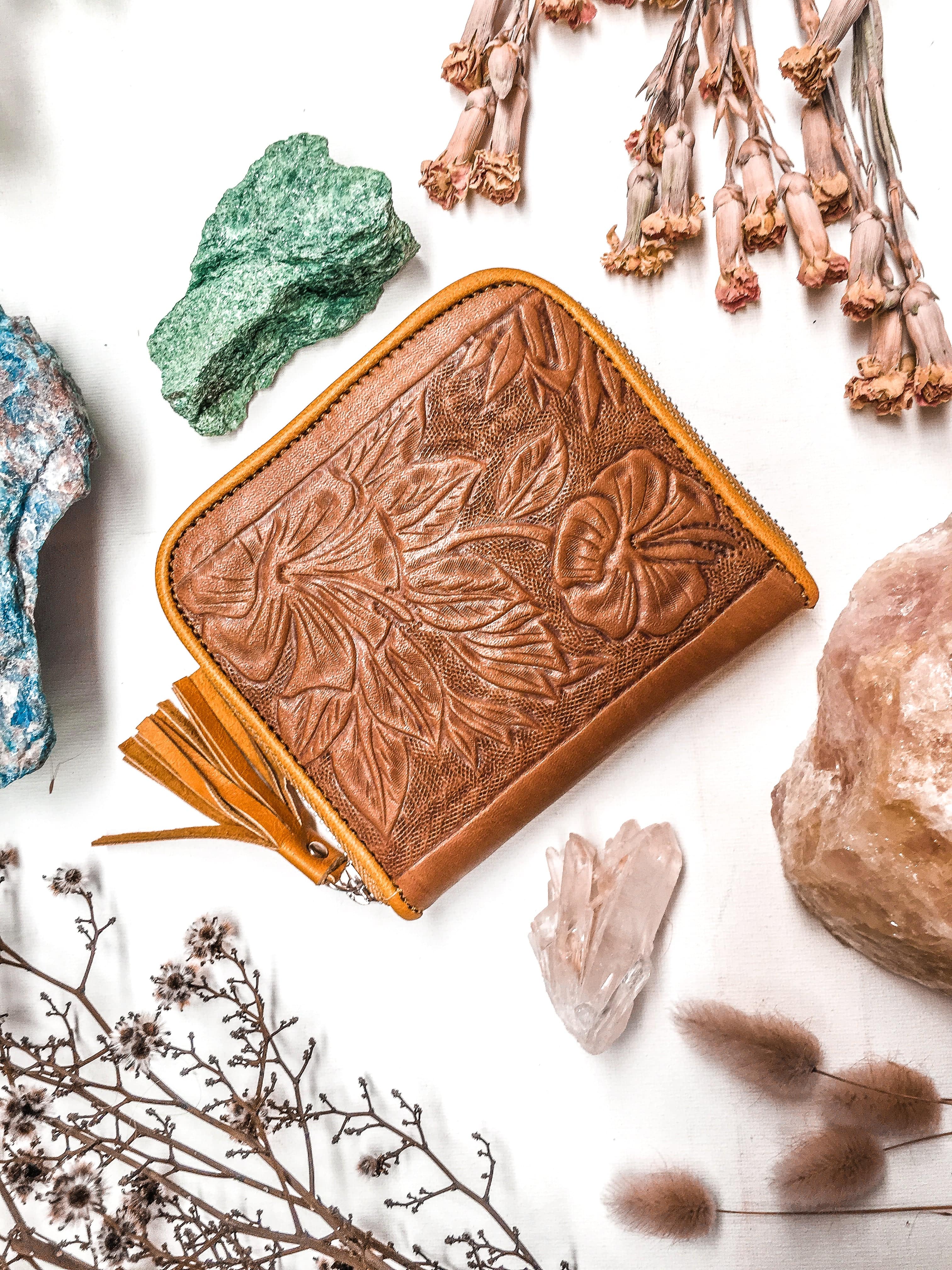 Our cute and compact hand tooled leather Aloha Purse is perfect for the girl on the go. Featuring intricate leather tooling flower design, this purse is made for exploring.