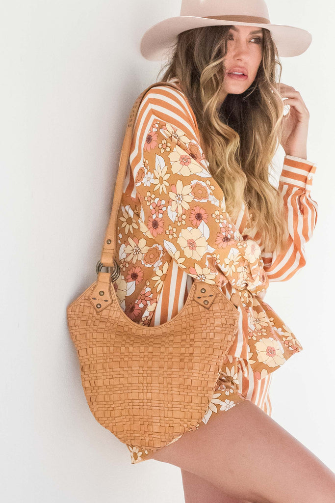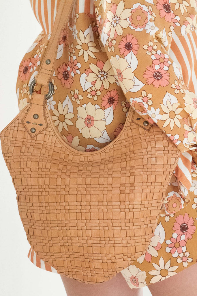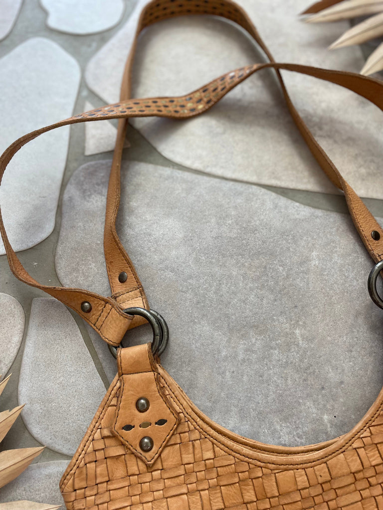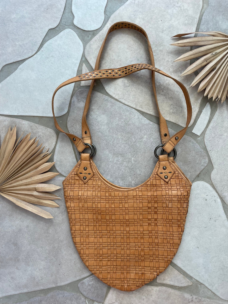 The Poloma boasts a distinctive weave pattern and intricate stud detailing, showcasing Mahiya's commitment to artisanal craftsmanship. This bucket bag is a testament to creativity and quality, designed for those who seek fashion with character.